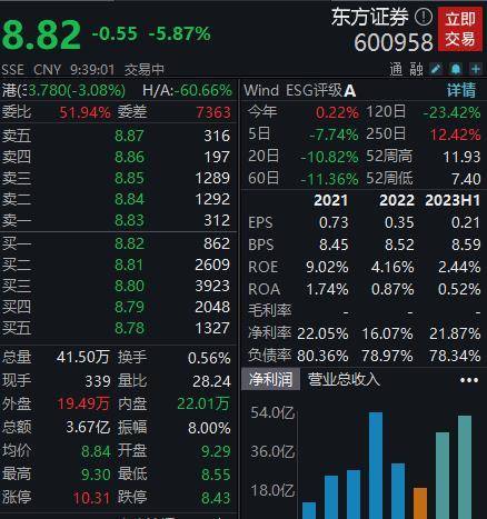 10月11日,东方证券低开低走,一度跌超8%。截至发稿,该股跌幅收窄至5.87%,报8.82元。