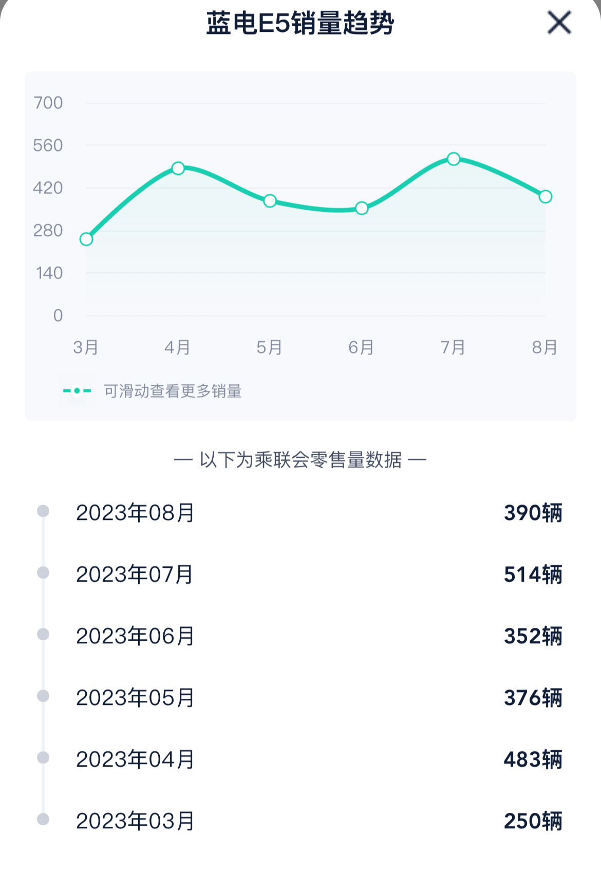 不过,卸下华为光环的蓝电,关注度和销量表现均不佳。汽车之家显示,3月至8月,蓝电E5的累计销量为2365辆,月销量基本处于300-500辆之间。