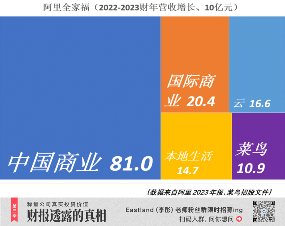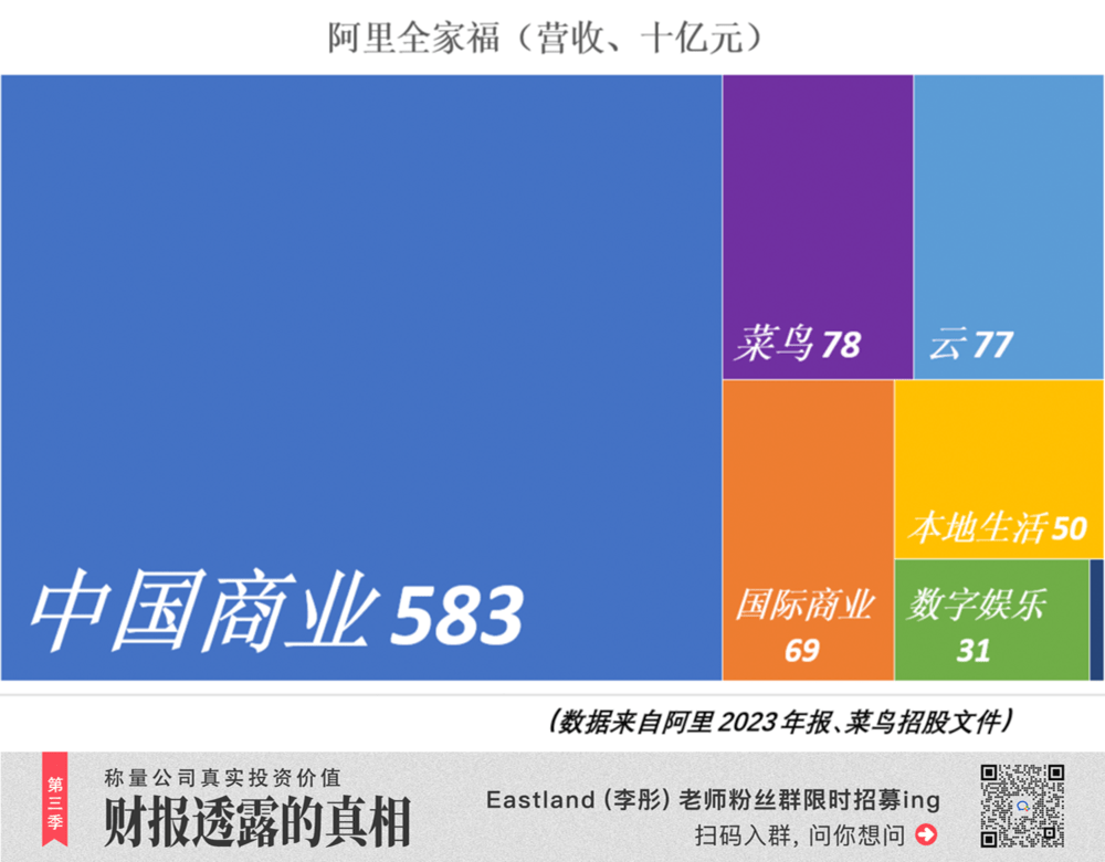 从2023年财年(截至2023年3月31日),阿里开始按中国商业、国际商业、本地生活服务、菜鸟、云业务、数字娱乐、创新等七个经营分部披露业绩,包括营收、经营利润、EBITDA等数据。