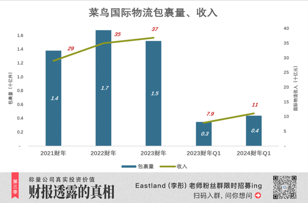 2023财年(截至2023年3月31日),菜鸟国际物流收入369亿件、包裹量15.2亿(顺丰同期国际包裹量6800万件)。2024财年Q1(2023年4月1日~6月30日),国际物流收入111亿、包裹量4.4亿件(顺丰同期国际包裹量2000万件)。