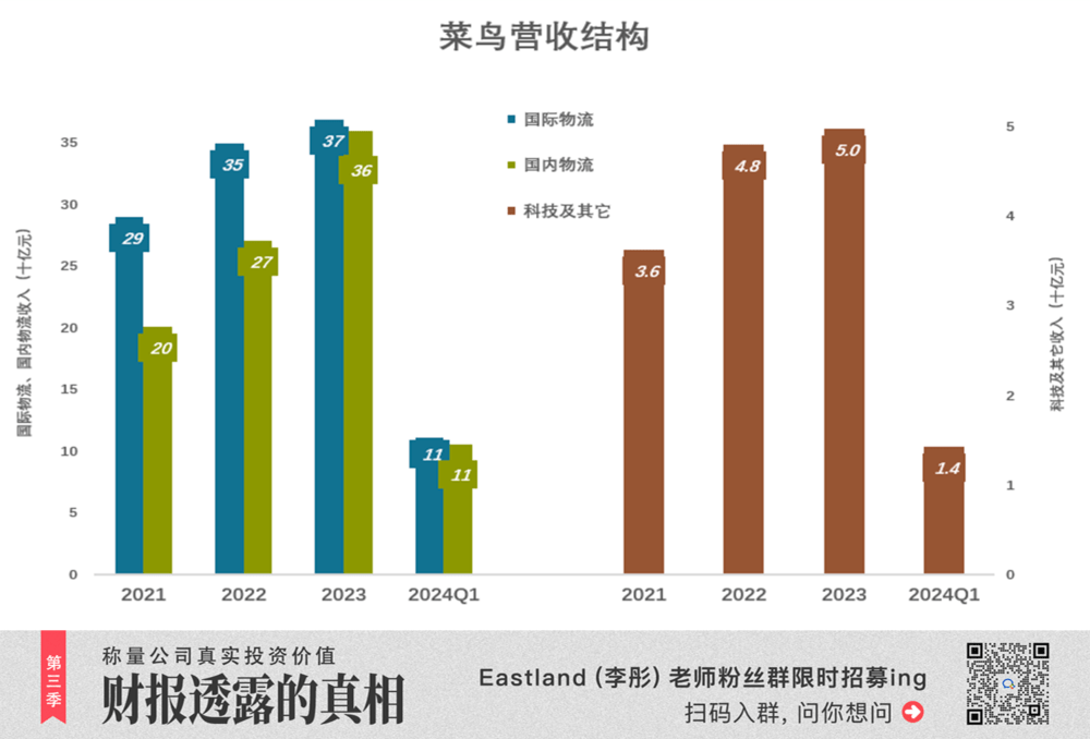 “科技及其它”(简称科技服务)收入主要包括菜鸟驿站服务费、菜鸟APP线上营销收入、技术服务费等。2023财年,科技服务营收50亿;2024财年Q1营收14.3亿。