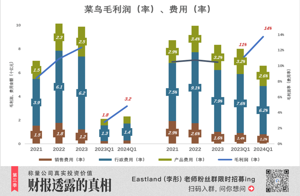 2024财年Q1(自然季2023年Q2),菜鸟财务状况显著改善:毛利润32亿、三项费用合计23亿,扣非经营利润8.6亿;毛利润率13.7%,三项费用合计占营收的10%,扣非经营利润率3.7%。