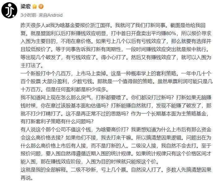 10月8日,百亿私募希瓦资产创始人、董事长梁宏就报价浙江国祥一事在雪球网发帖称,打新有周期性,一段时间赚钱效应突出就是报中就行。等出现几个破发了,有亏钱效应了,得小心打了。一个新股打中个几百万,上市马上卖掉。这是一种概率学上的套利策略。