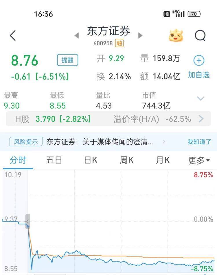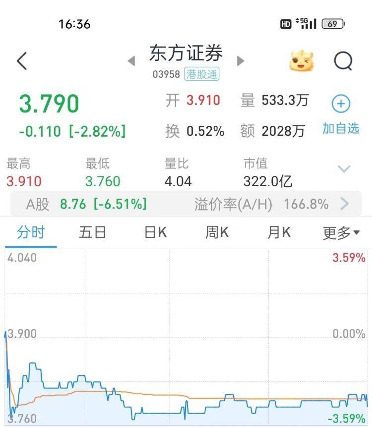 二级市场上,东方证券A股(600958.SH)今日早盘低开低走,盘中一度跌逾8%,至收盘报8.76元/股,跌6.51%;东方证券港股(03958.HK)报3.79港元/股,跌2.82%。