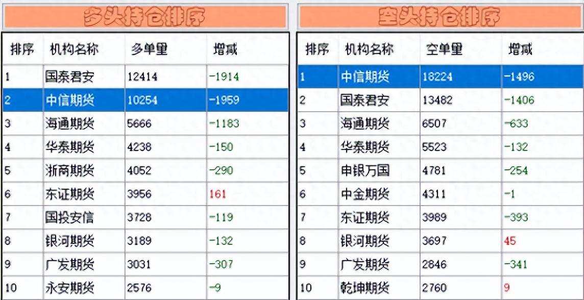 先来看下对下一个交易日有预判作用的“神器”——中信期货在股指期货上的增减持情况。它在沪深300股指期货上多单方面减仓1959手,空单方面减仓1496手,多单减仓量大于空单减仓量,给出了“偏空”的信号——预判失误。