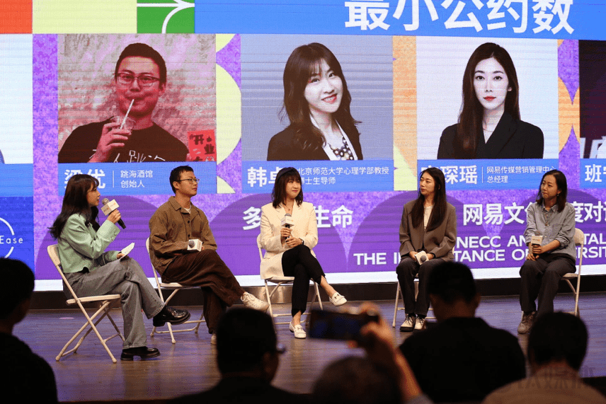 2023 年 10 月 9 日,网易文创在北京 751 园区举办了一场以“多维的生命”为主题的年度对话,拉开了文创品牌升级的序幕。现场由网易文创总经理刘晶分享了对文创内容方向的新思考,并邀请到跳海酒馆创始人梁优、北京师范大学心理学部教授、博士生导师韩卓、网易文创总经理刘晶、网易传媒营销管理中心总经理宋琛瑶、IP “我的爸爸是条龙”主理人班宁等嘉宾,就年轻人的精神追求、年轻人如何走出“至暗时刻”、IP 和年轻人的情绪价值链接等话题展开对谈。