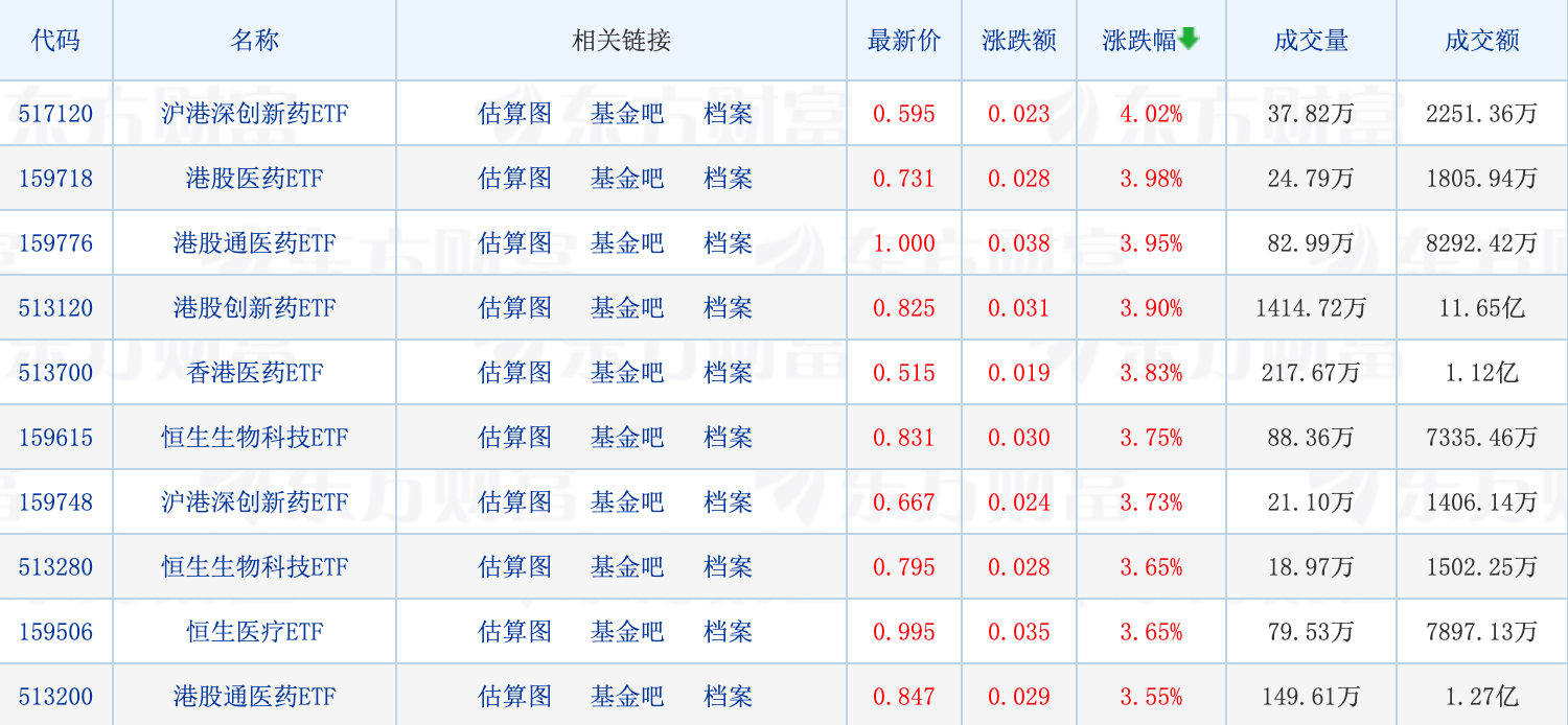 具体来看,医药股开盘集体大涨,减肥药、CRO方向领涨,百花医药、昭衍新药、华森制药等涨停。港股医疗保健板块今日大幅走强,带动生物医药相关ETF全线领涨,最高涨4.02%。