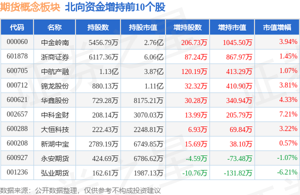 北向资金方面,当日期货概念板块北向资金持股市值为47.14亿元,减持0.41亿元。其中增持最多的是中金岭南,增持了0.1亿元。减持持最多的是物产中大,减持了0.2亿元。期货概念板块北向资金持股变动明细见下表: