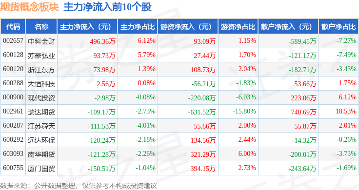 从资金流向上来看,当日期货概念板块主力资金净流出1.94亿元,游资资金净流入3424.78万元,散户资金净流入1.59亿元。期货概念板块个股资金流向见下表: