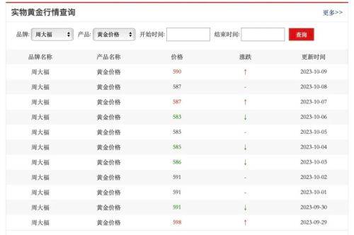 反映到首饰金行情,金投网数据显示,10月9日周大福(01929.HK)的最新金价有所回升,报590元/克。但与9月21日的高价615元/克相比仍有较大差距。国庆假期最后一天(10月6日),周大福金价一度跌至583元/克。