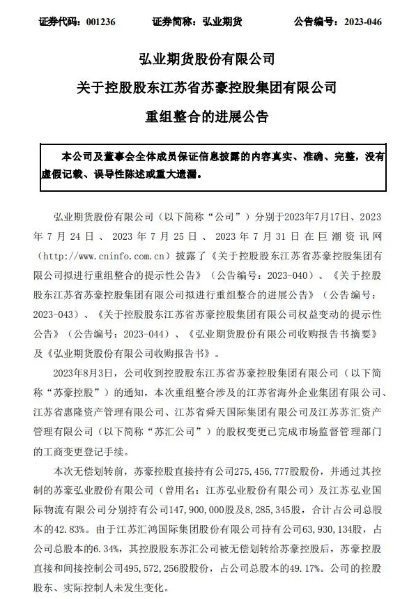 另外,今年7月,弘业期货宣布控股股东苏豪控股拟进行重组整合,此次收购系江苏省国资委将其持有的苏汇资管 100%股权无偿划转给苏豪控股持有,从而导致苏豪控股直接以及间接控制的弘业期货表决权比例将由原来的 42.83%升至 49.17%。