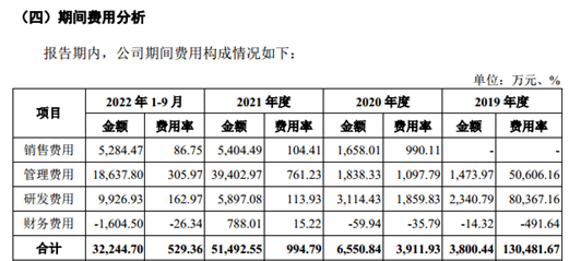 首先,销售费用方面。2020年-2021年和2022年1-9月,北芯生命的销售费用分别为1658.01万元、5404.49万元、5284.47万元,分别占当期营业收入的990.11%、104.41%、86.75%,同行业可比公司销售费用率的平均值分别为25.99%、27.98%、23.48%,北芯生命的销售费用率远高于同行均值。