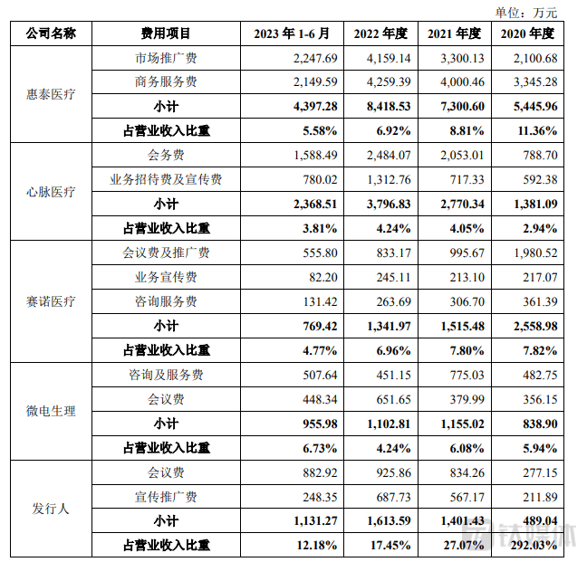 可见,2022年和2023年上半年,北芯生命在会议费、宣传推广费合计投入的金额均超过了赛诺医药和微电生理。