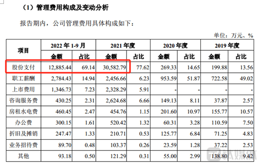 其次,管理费用方面。报告期内,北芯生命的管理费用分别为1474.97万元、1838.33万元、39402.97万元、18637.8万元,导致2021年和2022年1-9月公司管理费用达到上亿元的主要因素是因为其进行了股份支付,股份支付的金额分别为30582.79万元、12885.44万元。