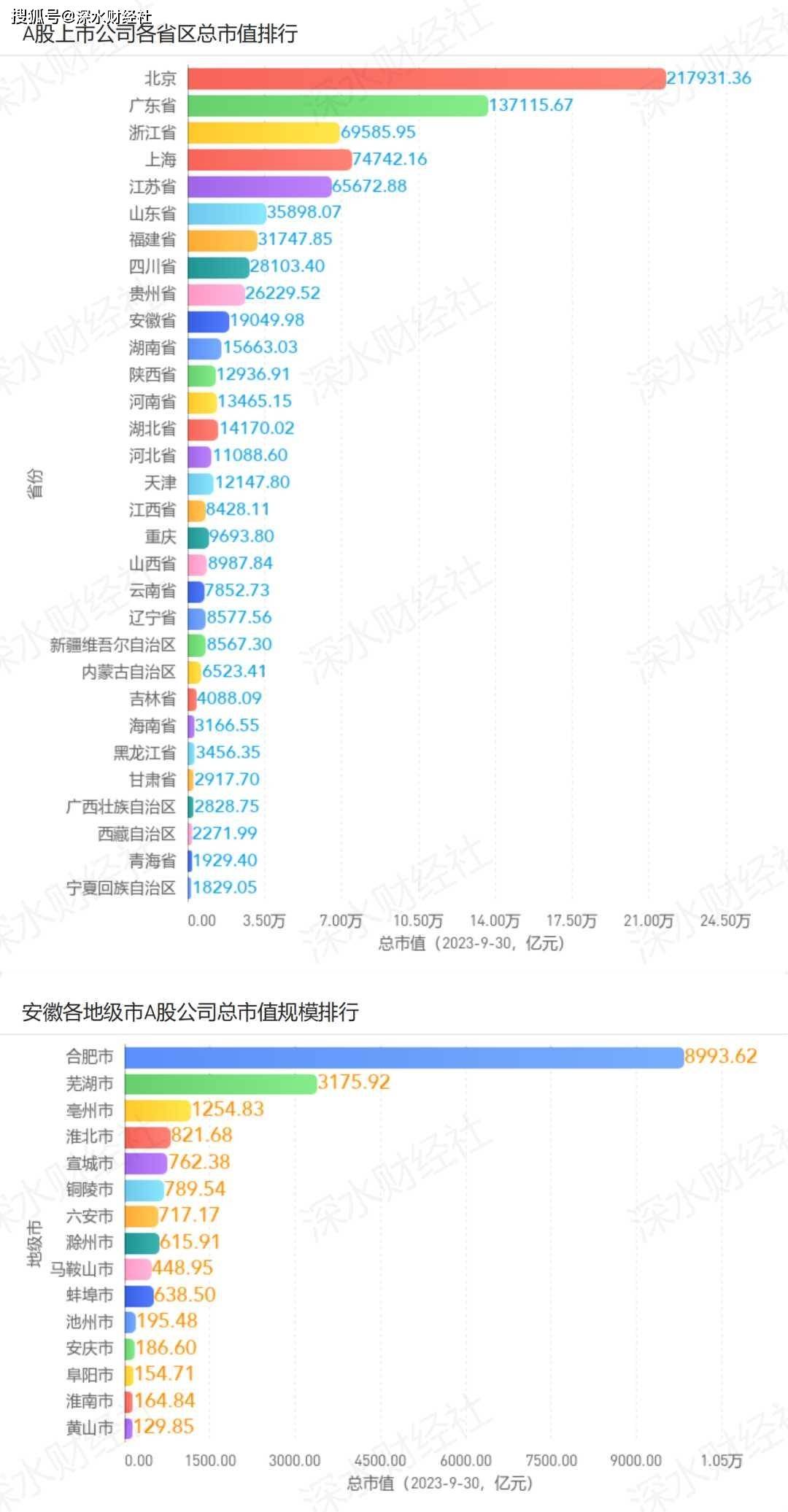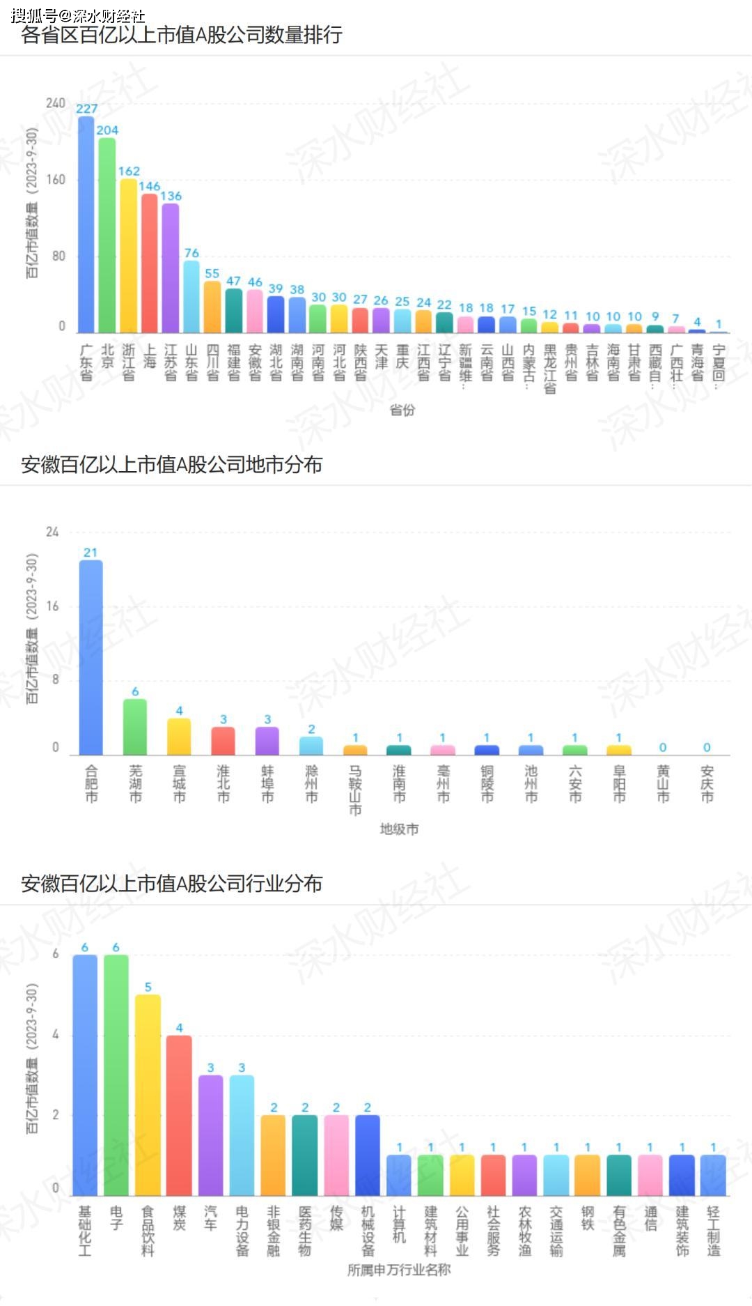 截至9月末,A股共有百亿以上市值公司1502家,其中广东省有227家,北京有204家,浙江有162家,安徽有46家排名第九。