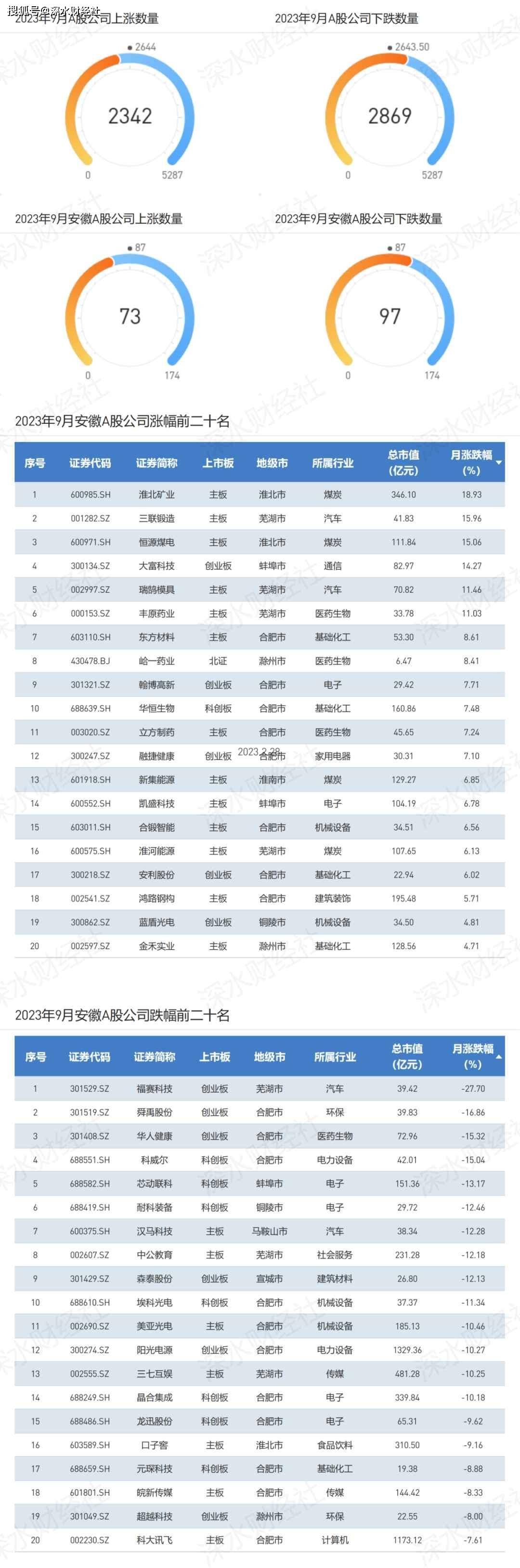 三季度的A股市场落下帷幕,回顾9月,市场表现并不理想,三大指数悉数下跌,上证指数下跌0.30%,深证成指下跌2.96%,创业板指下跌4.69%。具体看安徽板块,截至9月末,174只个股中有73家公司在9月收涨,97家公司在9月收跌。下文为深水财经社发布的“2023年9月安徽资本市场月度发展报告”,为各位看官从市场、市值、地域、后备企业等多个角度全面展现安徽A股9月表现情况。