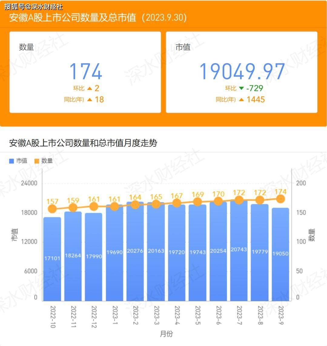 截至9月末,安徽A股公司总数达174家,较上月新增2家,同比2022年9月增加18家;总市值录得1.9万亿,环比上月减少729亿,同比2022年9月增加1445亿。