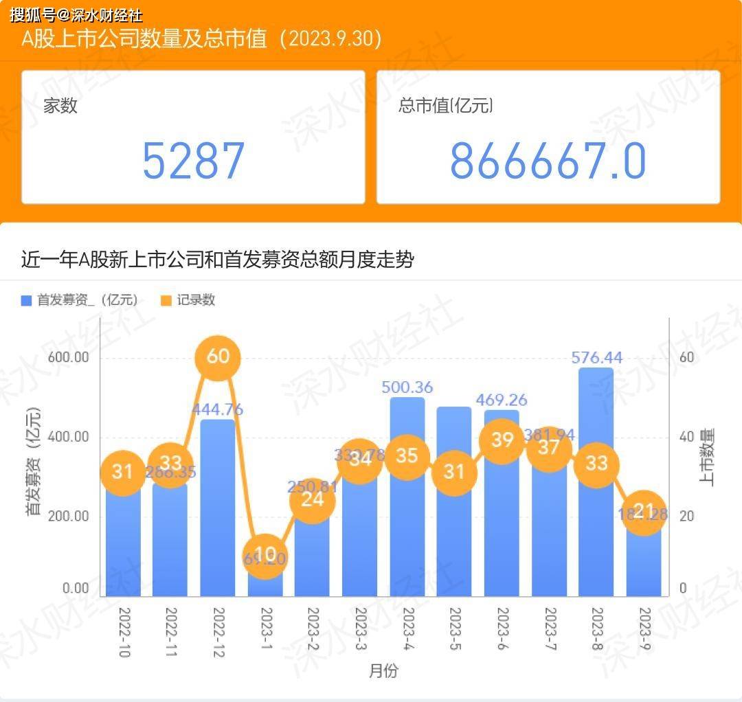 上图为深水财经社制作的近一年A股新上市公司和首发募资总额月度走势图,可以看出,9月无论是新增公司数量还是首发募资额,都较前几月有较大落差。