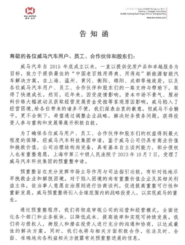 威马汽车回应申请破产重整