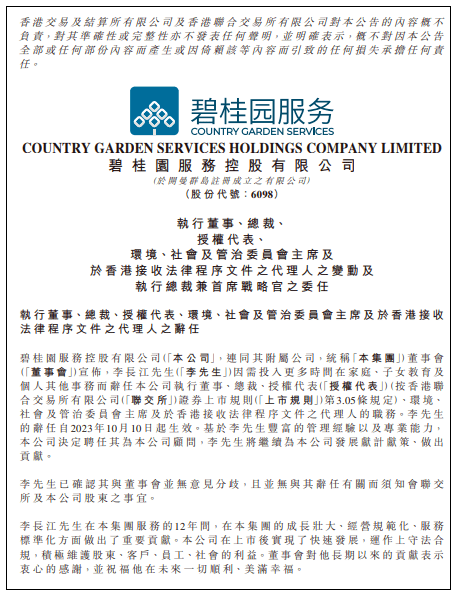 10月10日晚,碧桂园服务在港交所发布公告称,李长江因需投入更多时间在家庭、子女教育及个人其他事务,辞任公司执行董事,总裁,授权代表,环境、社会及管治委员会主席,于香港接收法律程序文件的代理人职务。李长江的辞任自10月10日起生效。