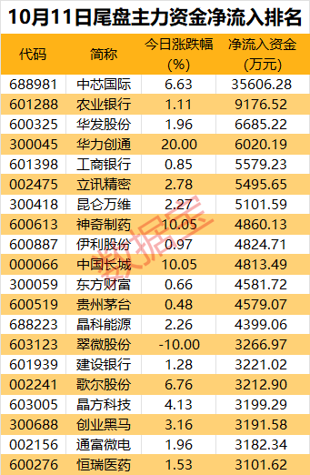 个股方面,有7股尾盘净流入超5000万元。中芯国际资金流入最高,金额为3.56亿元;今日尾盘该股拉涨至6.63%。