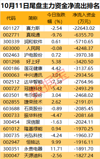 数据宝统计,7股尾盘流出资金超3000万元。赛力斯尾盘主力资金净流出超2亿元,居首位;真视通和润和软件均净流出超5000万元。