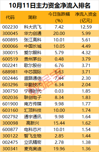 从个股看,有40股资金净流入超亿元。科大讯飞主力资金净流入金额最高,达到12.59亿元,股价上涨7.42%。人工智能板块今日反弹,消息面上,有媒体报道称,台积电2024年AI订单比重有望较今年显著成长约6%,创历史新高。
