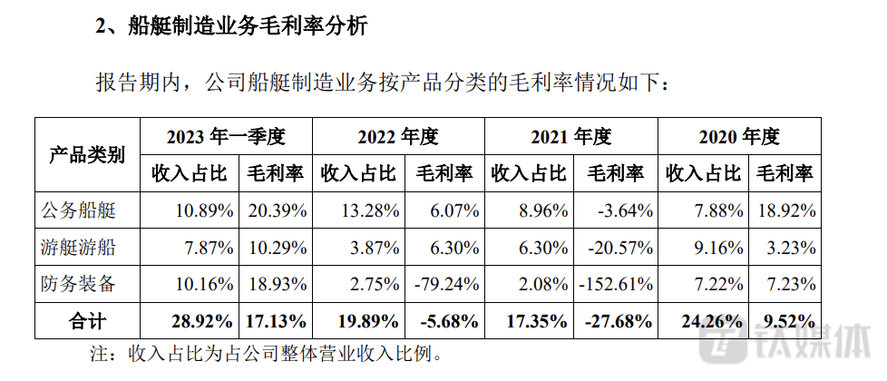 同时,该业务的毛利率波动较大,2020年-2023年上半年,公司船艇制造业务毛利率分别为9.52%、-27.68%、-5.68、10.19%,船艇制造业务曾在2021年和2022年出现亏损情况。