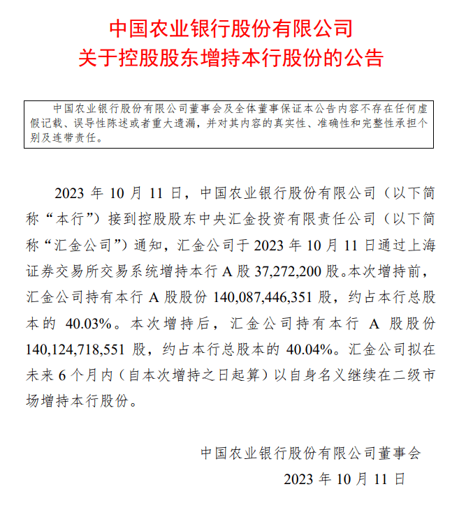10月11日,中国农业银行发布公告称,接到控股股东中央汇金投资有限责任公司通知,汇金公司于2023年10月11日通过上海证券交易所交易系统增持本该银行A股约3727万股。汇金公司拟在未来6个月内(自本次增持之日起算)以自身名义继续在二级市场增持农行股份。