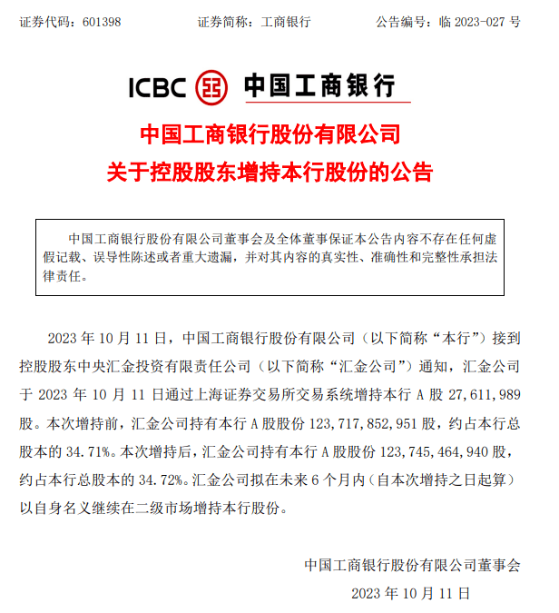 工商银行公告,控股股东汇金公司10月11日增持本行2761万股A股股份,拟在未来6个月内(自本次增持之日起算)以自身名义继续在二级市场增持本行股份。