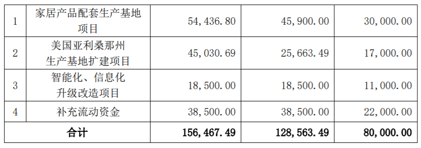 募资金额缩水的同时,公司也将募集资金投资项目对应拟投入募集资金金额做出了相应的调整,并且表示募集资金不足的部分将由公司自筹解决。其中投在家居产品配套生产基地等3个关于业务向的项目投资建设的资金,拟募资总额由约9亿元,向下调整为5.8亿元;用于补充流动资金的金额,由3.85亿元,向下调整为 2.2 亿元。