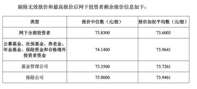 公告显示,公募基金、社保基金、养老金等机构的报价中位数为74.14元/股,报价加权平均数为73.9641元/股,均高于最终确定的发行价69.07元/股。