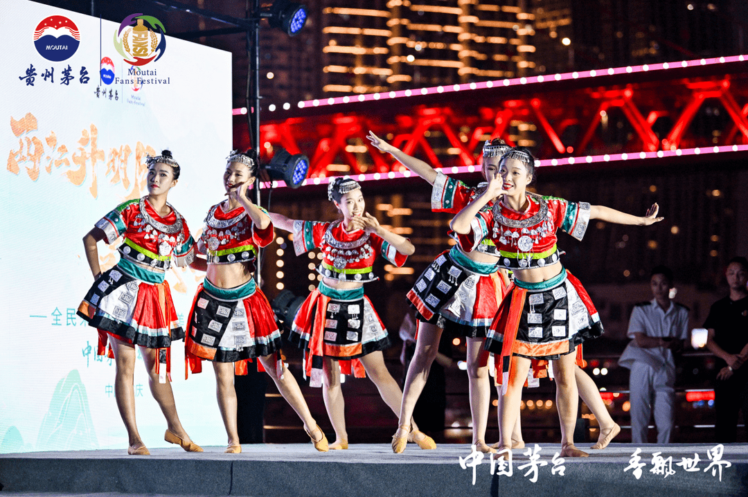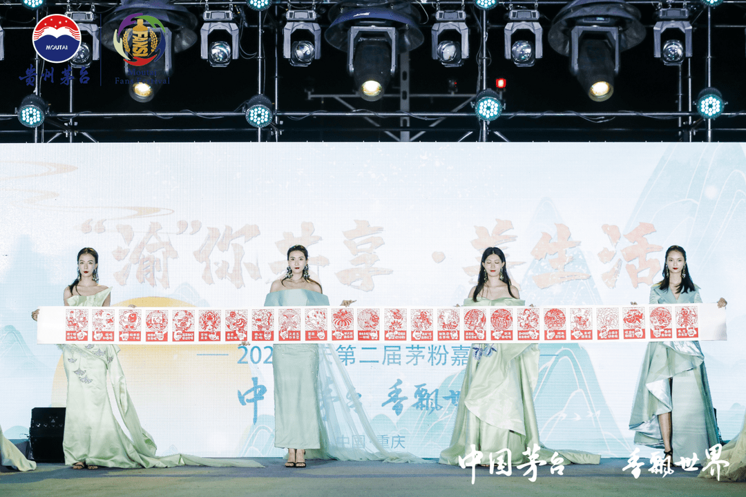 茅粉之夜上,茅粉们通过“渝”你相遇美山城、“渝”你共享美生活、“渝”你共酿美文化、“渝”你共瞰美时代等篇章,深切感受了茅台“各美其美,美美与共”的融合之美、茅台之美。贵州茅台文化品饮师通过茅台酒品鉴场景,分享观色、闻香、尝味等茅台酒品鉴知识,让茅粉近距离体验茅台酒的品饮之美;融合茅台与二十四节气元素的公益剪纸,幻化出引领时代的耀眼光彩,传递着人们对传统文化的热爱,对美好生活的向往;以“全民来运动 共创美生活”为主题的茅台“村BA”比赛精彩回顾及颁奖仪式,诠释坚韧、拼搏、不放弃的竞技精神,激励茅台人“棋心”拼搏建新功,同心开创美时代;“飞天之舞”带领茅粉穿梭时光,邂逅古丝绸之路,展现茅台以酒为媒,与中国式现代化同频共振,跃动起“一带一路”的茅台力量。