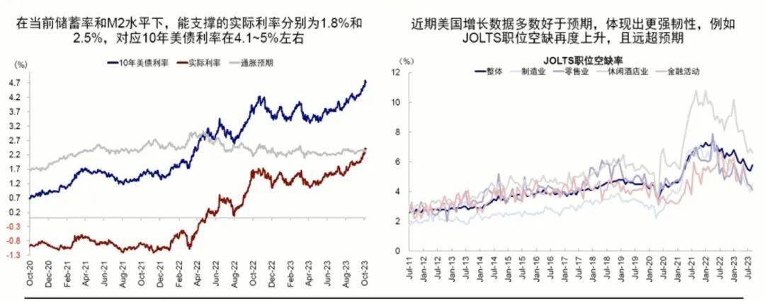 本轮美债利率上行很快,有个最重要的特征,用常用的第一个拆解方法实际利率加通胀预期,会发现左下图全都是实际利率贡献,通胀预期基本没动。大家可能会说通胀预期怎么只有2点几?实际利率隐含对于未来10年的通胀中枢,虽然短期的通胀还是上下起伏,上个月通胀还在往上抬,但10年的通胀中枢现在相对稳定在2.2%、2.3%左右。实际利率隐含拉长时间10年维度的增长预期,所以第一个结论它是对增长韧性的重新定价。