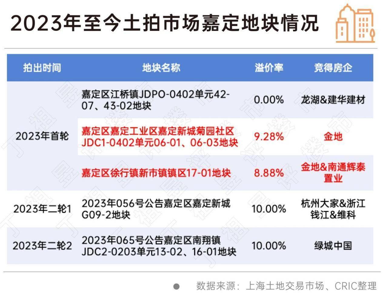基于嘉定的基本面及近几年的表现,2023年至今土拍市场,嘉定成为了各大房企争相抢夺的目标,除了今年首轮江桥镇地块外,其余所有地块都进入一次性报价或者最高限价成交,整体溢价率达7.63%。