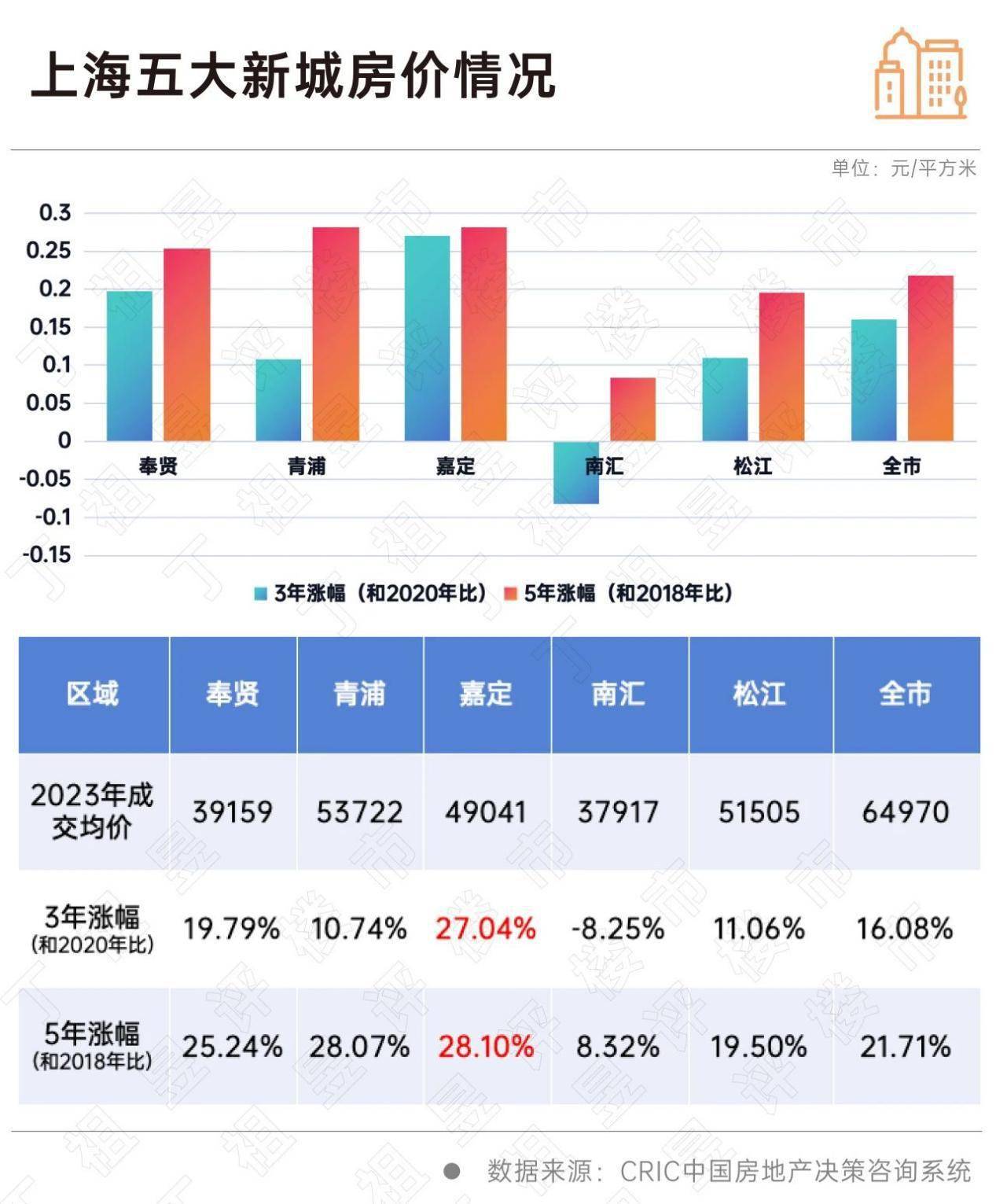 CRIC数据显示,2023年至今,嘉定商品住宅成交均价49041元/平方米,较2020年上涨27.04%,较2018年上涨28.1%,无论是3年涨幅还是5年涨幅都位于五大新城首位。