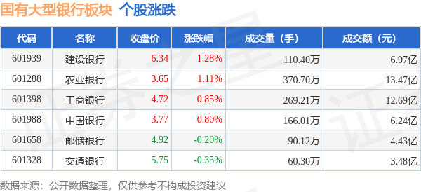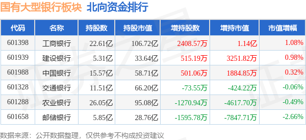北向资金方面,当日国有大型银行板块北向资金持股市值为389.11亿元,增持0.36亿元。其中增持最多的是工商银行,增持了1.14亿元。减持持最多的是邮储银行,减持了0.78亿元。国有大型银行板块北向资金持股变动明细见下表: