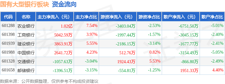 从资金流向上来看,当日国有大型银行板块主力资金净流入1.92亿元,游资资金净流出5704.24万元,散户资金净流出1.35亿元。国有大型银行板块个股资金流向见下表: