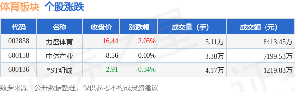 10月11日体育板块较上一交易日上涨0.36%,力盛体育领涨。当日上证指数报收于3078.96,上涨0.12%。深证成指报收于10084.9,上涨0.35%。体育板块个股涨跌见下表: