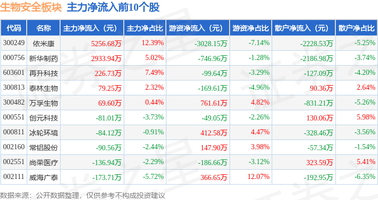 从资金流向上来看,当日生物安全板块主力资金净流入2438.23万元,游资资金净流出2183.43万元,散户资金净流出254.8万元。生物安全板块个股资金流向见下表: