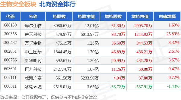 北向资金方面,当日生物安全板块北向资金持股市值为21.99亿元,增持0.46亿元。其中增持最多的是海尔生物,增持了0.2亿元。减持持最多的是冰轮环境,减持了537.91万元。生物安全板块北向资金持股变动明细见下表: