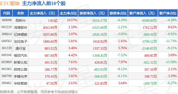从资金流向上来看,当日ETC板块主力资金净流出8.81亿元,游资资金净流入3371.06万元,散户资金净流入8.47亿元。ETC板块个股资金流向见下表: