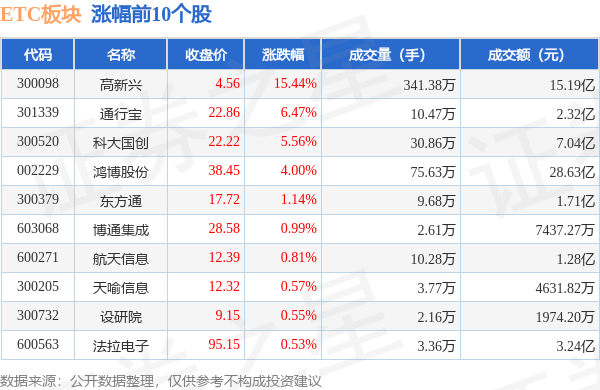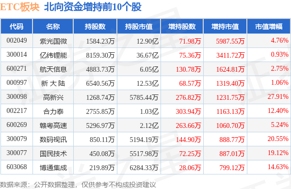 北向资金方面,当日ETC板块北向资金持股市值为148.49亿元,增持0.75亿元。其中增持最多的是紫光国微,增持了0.6亿元。减持持最多的是法拉电子,减持了0.41亿元。ETC板块北向资金持股变动明细见下表: