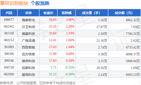 10月11日掌纹识别板块较上一交易日上涨0.89%,海泰新光领涨。当日上证指数报收于3078.96,上涨0.12%。深证成指报收于10084.9,上涨0.35%。掌纹识别板块个股涨跌见下表: