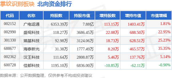 北向资金方面,当日掌纹识别板块北向资金持股市值为9.71亿元,增持0.33亿元。其中增持最多的是广电运通,增持了0.14亿元。减持持最多的是佳都科技,减持了62.11万元。掌纹识别板块北向资金持股变动明细见下表: