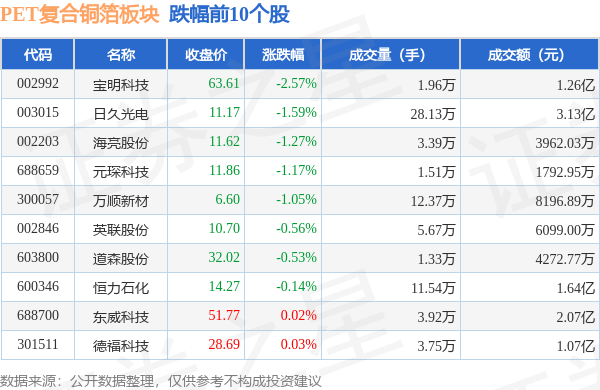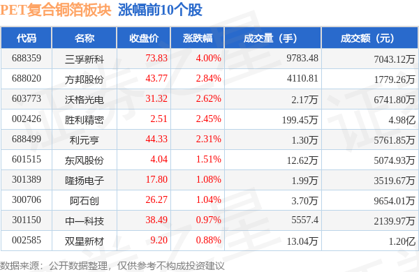 10月11日PET复合铜箔板块较上一交易日上涨0.14%,三孚新科领涨。当日上证指数报收于3078.96,上涨0.12%。深证成指报收于10084.9,上涨0.35%。PET复合铜箔板块个股涨跌见下表: