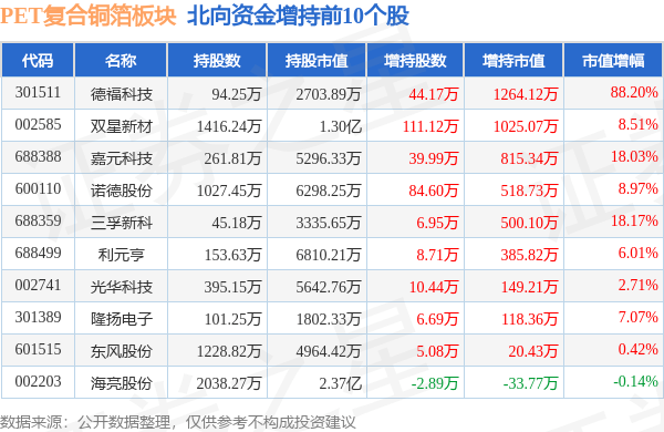 北向资金方面,当日PET复合铜箔板块北向资金持股市值为28.11亿元,减持360.88万元。其中增持最多的是德福科技,增持了0.13亿元。减持持最多的是胜利精密,减持了0.16亿元。PET复合铜箔板块北向资金持股变动明细见下表: