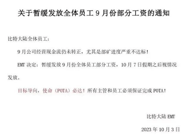 据互联网门户网站DoNews消息,据多名比特大陆内部员工确认,比特大陆发布通知:9月公司经营现金流仍未转正,尤其是部矿(指矿机进驻矿场)进度严重不达标,EMT决定暂缓发放9月份全体员工部分工资,10月7日假期之后视情况发放。