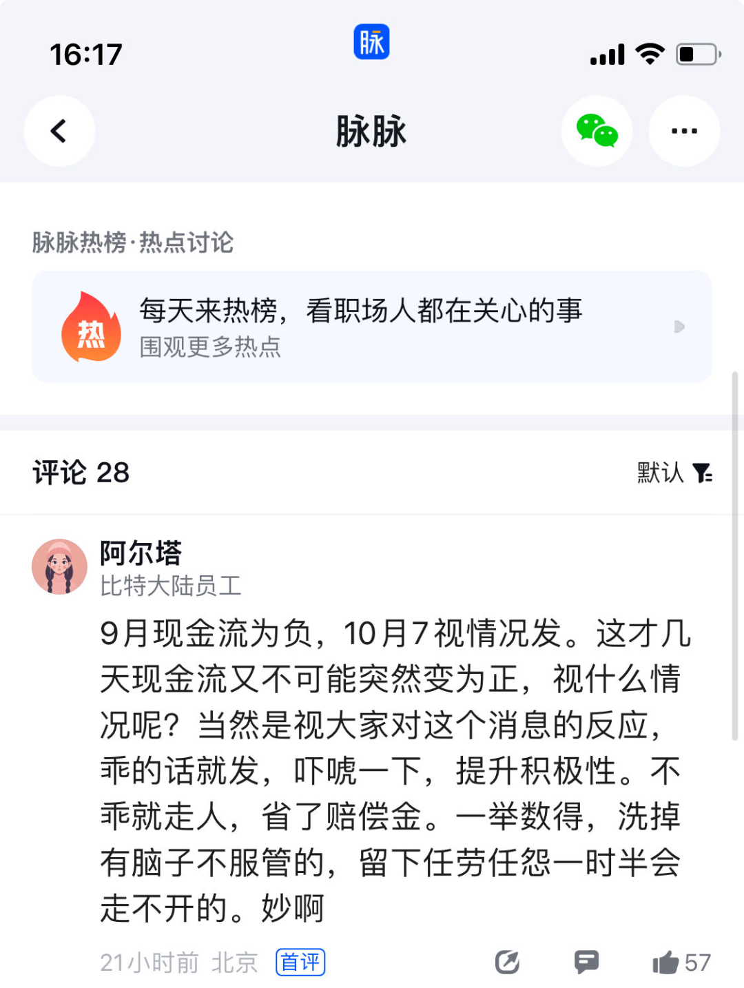 另有认证为比特大陆员工的用户吐槽,比特大陆9月份现金流为负,10月7日后视情况发,几天时间现金流不可能突然变为正,这是公司提升员工积极性、“优化”员工的一种手段。