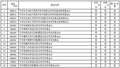 2、基金转换是指基金份额持有人按照《基金合同》和基金管理人届时有效公告规定的条件,申请将其持有基金管理人管理的、某一基金的基金份额转为基金管理人管理的、且由同一注册登记机构办理注册登记的其他基金的基金份额的行为。基金转换业务规则与转换业务的收费计算公式参见本公司网站的《平安基金管理有限公司关于旗下开放式基金转换业务规则说明的公告》。